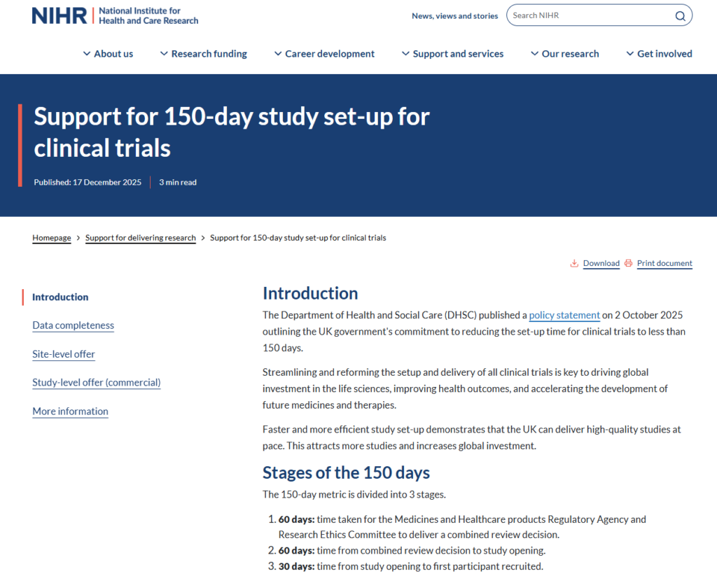 NIHR support for 150-day study set-up for clinical trials